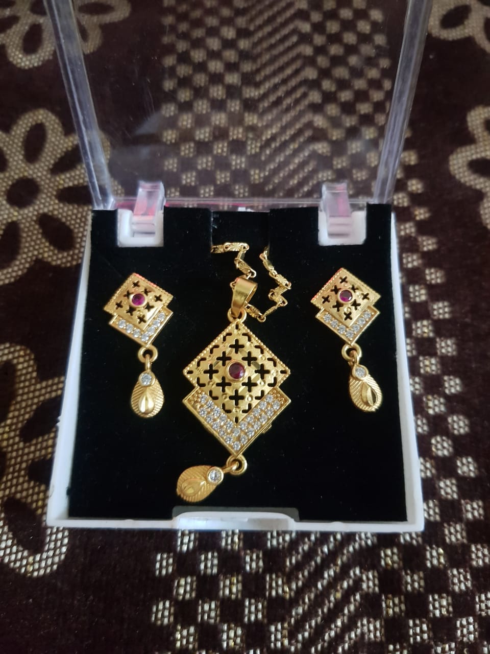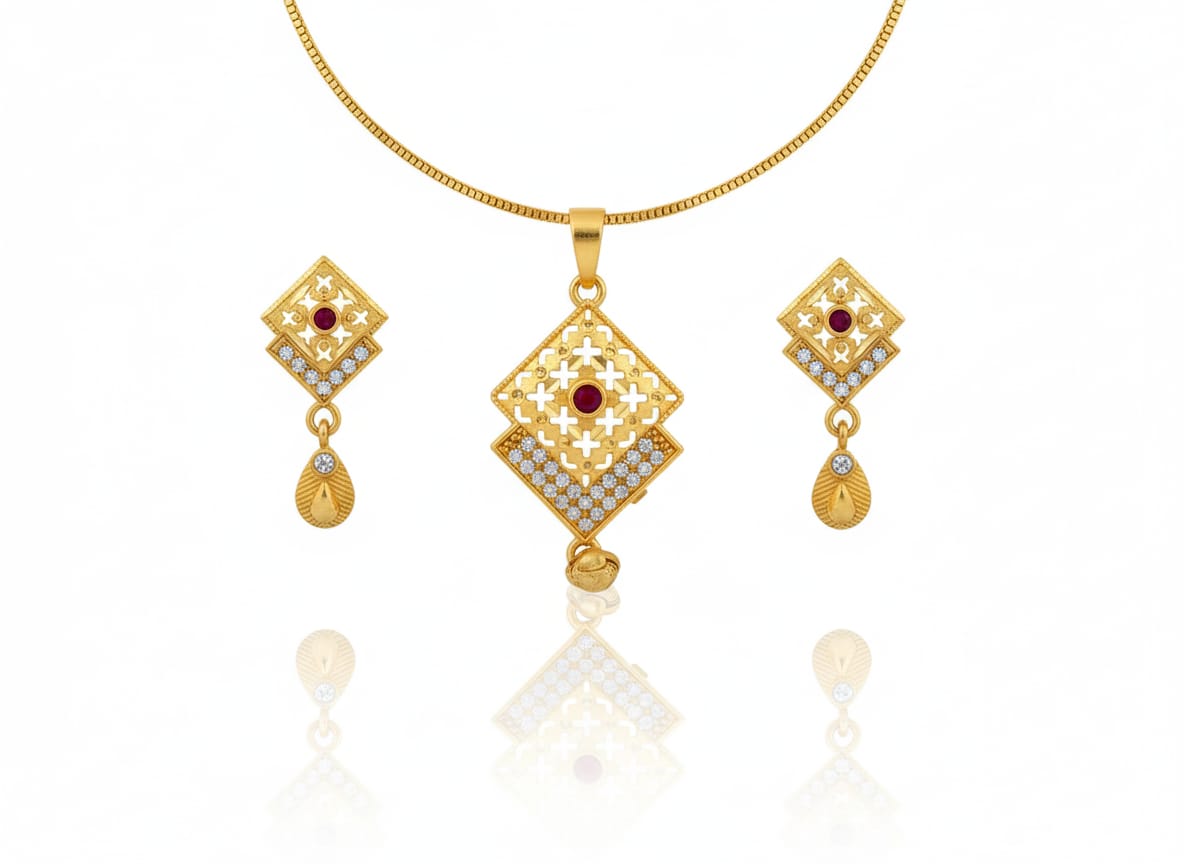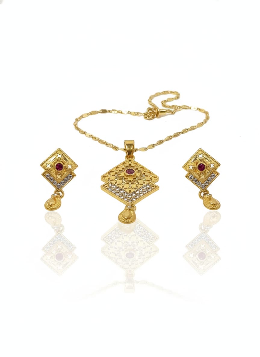 Product Title: “Ethnic Gold Plated Diamond and Ruby Designer Pendant and Earring Set for Women”)